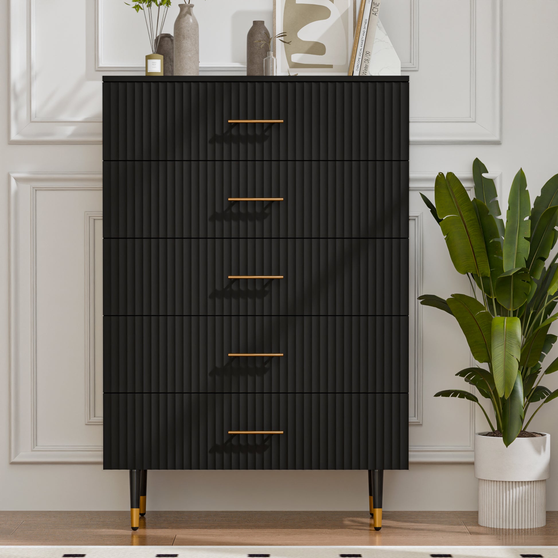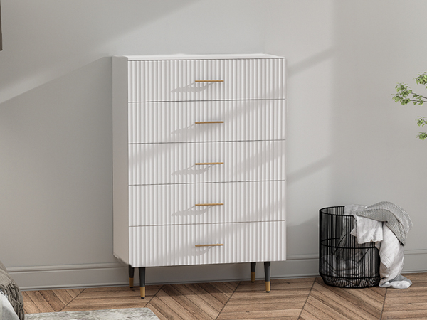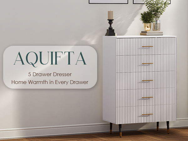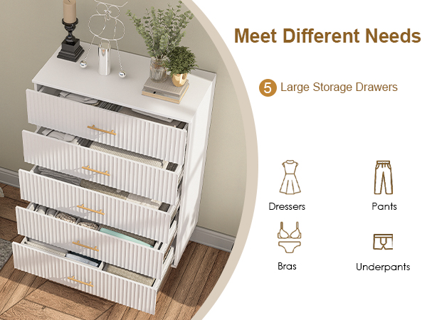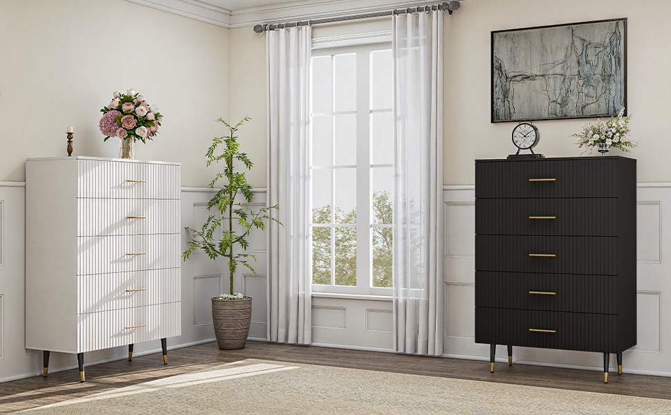 - Ample Storage with Multi-Functional Design: Featuring five generously sized drawers, this 5 drawer dresser provides plenty of room to keep clothing, cosmetics, and accessories organized and easily accessible. The spacious top surface serves multiple purposes — use it as a vanity,or to showcase decorative items like photos, plants, or mirrors. A sleek and practical piece that enhances bedrooms, living rooms, entryways, or hallways alike