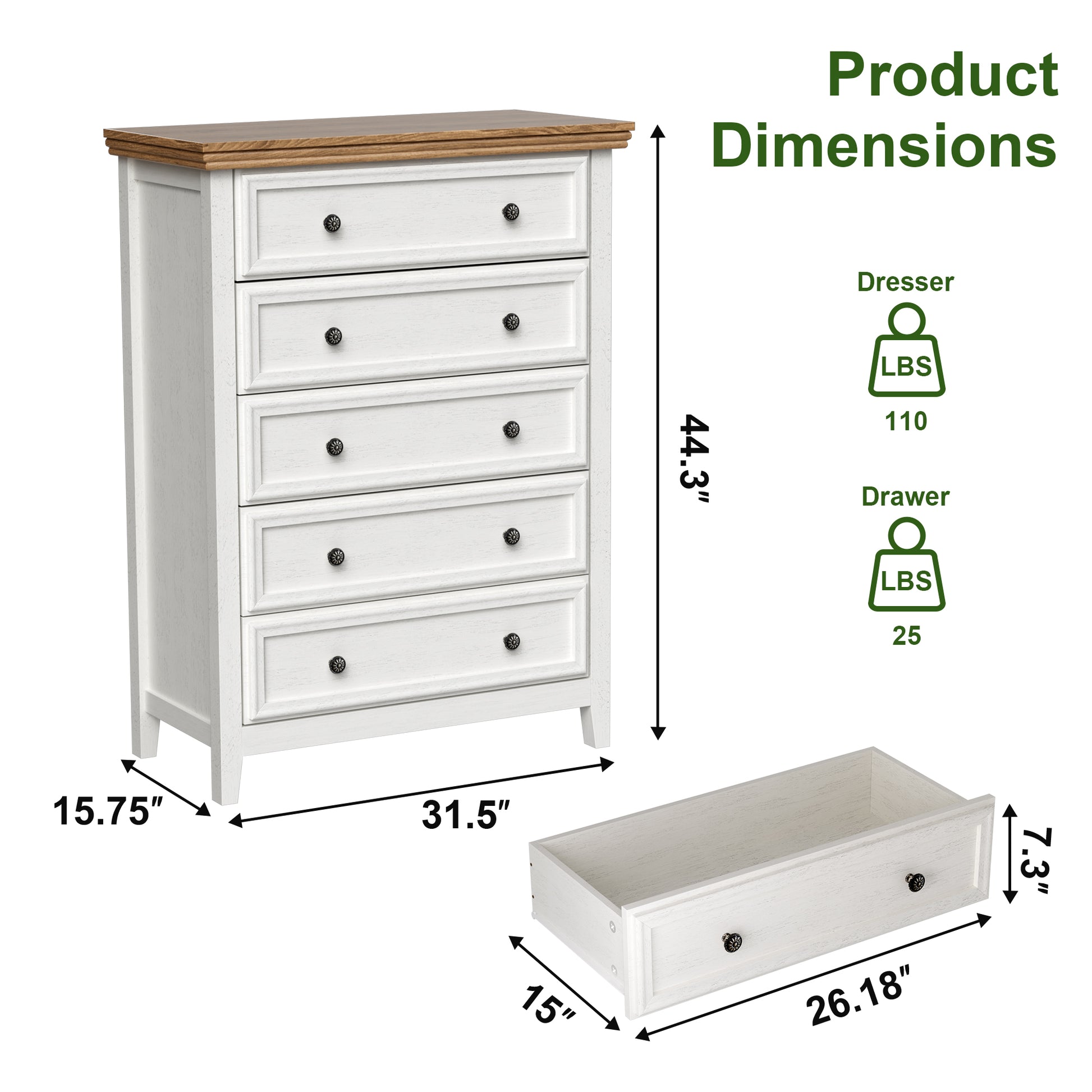 - Large Storage Capacity:The dressers feature 5 deep drawers that provide plenty of room for organizing clothing, bedding, cosmetics, or jewelry, helping you maintain a neat and tidy space.The wide tabletop can serve as a dresser, TV stand or display your decorations such as photo frames, plants or mirrors.Ideal for the bedroom, living room, hallway, or entryway